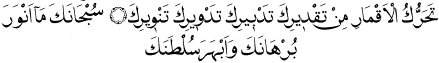Ayların hareket etmesi Senin taktirin ve tedbirin, döndürmen, aydınlatman iledir. Sen her türlü noksan sıfatlardan münezzehsin; Senin bürhanın ne nurludur, Senin saltanatın ne açıktır.