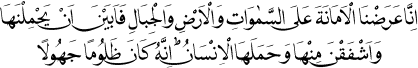 Biz emâneti göklere, yere ve dağlara teklif ettik; hepsi de onu yüklenmekten kaçındılar ve ondan korktular. İnsan ise onu yüklendi. Gerçekten insan çok zâlim, çok câhildir. (Ahzâb Sûresi: 72.)