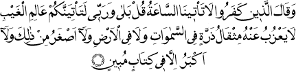 İnkâr edenler, "Kıyâmet başımıza gelmez" derler. Sen de ki: Evet gaybı bilen Rabbime yemin olsun ki başınıza gelecektir. Ne göklerde ve ne de yerde zerre kadar bir şey Ondan uzak kalamaz; bundan küçük veya büyük ne varsa hepsi ap açık bir kitapta yazılmıştır. (Sebe’ Sûresi: 3.)