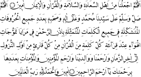 Allahım, Efendimiz Muhammed’e, onun âl ve ashâbına, indiği günden itibâren tâ kıyâmete kadar, onu okuyan her okuyucunun her kelimesini okuması esnâsında Allah’ın izniyle hava dalgalarının aynasına yansıyan bütün Kur’ân kelimelerinin bütün harfleri adedince salât ve selâm eyle. Bize, anne ve babamıza, erkek ve kadın bütün müminlere bu salavâtlar adedince merhamet et. Bunu rahmetinle yap, ey merhametlilerin en merhametlisi! Duâmızı kabul buyur. Alemlerin Rabbi olan Allah’a hamd olsun.