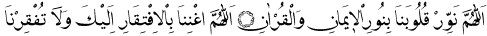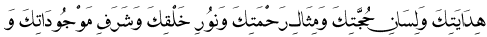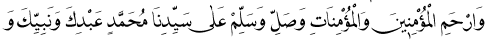 Allah’ım, kalplerimizi imân ve Kur’ân nuruyla nurlandır. Allah’ım, bizi Sana muhtaç olduğumuzun şuuruyla zenginleştir; Senden müstağnî durma fakirliğine düşürme. Kendi güç ve kuvvetimizden teberrî ediyor, Senin havl ve kuvvetine sığınıyoruz. Bizi Sana tevekkül edenlerden kıl. Bizi nefsimizin eline bırakma. Bizi, koruyuculuğunla muhâfaza eyle. Bize ve erkek, kadın bütün müminlere merhamet et. Kulun, peygamberin, seçtiğin, dostun, mülkünün güzelliği, masnuâtının melîki ve sultanı, inâyetinin gözbebeği, hidâyetinin güneşi, hüccetinin lisânı, rahmetinin timsâli, mahlûkatının nuru, mevcudâtının şerefi, mahlûkatının çokluğu içinde birliğinin kandili, kâinat tılsımının keşşâfı, rubûbiyet saltanatının dellâlı, hoşnut olduğun şeylerin tebliğ edicisi, gizli isimlerinin tanıtıcısı, kullarının muallimi, âyetlerinin tercümânı, rubûbiyet güzelliğinin aynası, şuhud ve işhâdının medârı, âlemlere rahmet olarak gönderdiğin habîbin ve resûlün olan Efendimiz Muhammed’e, onun bütün âl ve ashâbına, kardeşleri olan diğer peygamber ve resûllere, melâike-i mukarrebîne ve sâlih kullarına salât ve selâm eyle. âmin.