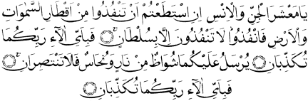 1 Ey cinler ve insanlar topluluğu! Eğer göklerin ve yerin sınırlarından çıkıp gitmeye gücünüz yeterse, haydi, çıkın. Fakat Allah’ın vereceği bir kuvvet olmadan çıkamazsınız. • Rabbinizin nimetlerinden hangi birini inkâr edersiniz? • Üzerinize saf ateşten bir alevle bakır gibi kızıl bir duman salınır da, birbirinize hiçbir yardımınız dokunmaz. • Rabbinizin nimetlerinden hangi birini inkâr edersiniz? (Rahmân Sûresi: 33-36.)