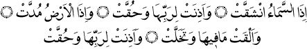2 Gök yarıldığında • Rabbinin emrine boyun eğdiğinde-ki ona lâyık olan da budur. • Yer dümdüz edildiğinde. • İçinde ne varsa atıp boşaldığında. • Rabbinin emrine boyun eğdiğinde-ki ona lâyık olan da budur. (İnşikak Sûresi: 1-5.)