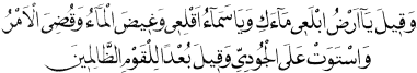 3 Ve denildi ki: "Ey yer, suyunu yut. Ey gök, suyunu tut." Su çekildi, iş bitirildi ve gemi Cûdî Dağına oturdu. Ve "Zâlimler gürûhu Allah’ın rahmetinden uzak olsun" denildi. (Hûd Sûresi: 44.)