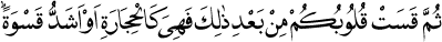 1 Sonra, bütün bunların ardından kalbiniz yine katılaştı. Sanki taş kesildi, hattâ taştan da katılaştı. (Bakara Sûresi: 74.)