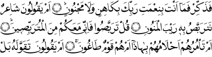 1 Sen öğüt vermeye devam et. Rabbinin sana verdiği peygamberlik nimeti hakkı için, sen ne bir kâhinsin, ne de bir mecnun. • Yoksa onlar "O bir şâirdir; biz onun başına gelecek felâketi bekliyoruz" mu diyorlar? • Sen "Bekleye durun," de. "Ben de sizinle beraber bekliyorum." • Onlar akıllarını kullanarak mı bunu söylüyorlar, yoksa onlar sırf bir azgınlar gürûhu mudur? • Yahut Kurân’ı kendisi mi uydurdu diyorlar? Doğrusu onların imân etmeye niyetleri yoktur. • Eğer doğru söylüyorlarsa, Kur’ân’ın benzeri bir söz getirsinler. • Yoksa onlar bir yaratıcı olmaksızın mı yaratıldılar? Veya kendi kendilerini mi yaratıyorlar? • Yoksa gökleri ve yeri onlar mı yarattı? Doğrusu onların düşünüp imân etmeye niyetleri yoktur. • Yoksa Rabbinin hazîneleri onların yanında mı? Veya kâinatın tedbîr ve idaresini onlar mı ele geçirdi? • Yoksa göklere çıkıp da gök ehlinin haberlerini dinlemek için bir merdivenleri mi var? Öyleyse dinleyicileri, işittiklerine dâir açık bir delil getirsin. • Yoksa kız çocukları Onun, erkek çocuklar da sizin mi? • Yoksa sen onlardan bir ücret istedin de onlar ağır bir borç altına mı girdiler? • Yoksa gaybın ilmi onların yanında da oradan mı alıp yazıyorlar? • Yoksa sana bir tuzak mı kurmak istiyorlar? Fakat o kâfirler tuzağa düşecek olanların tâ kendileridir. • Yoksa onların Allah’tan başka bir ilâhı mı var? Allah onların ortak koştukları şeylerden münezzehtir. (Tûr Sûresi: 29-43.)