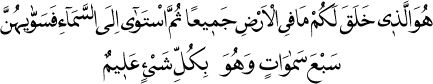 1 Yeryüzünde ne varsa sizin için O yarattı. Bundan başka semâya da irâdesini yöneltti ve gökleri yedi tabaka olarak tanzim etti. O her şeyi hakkıyla bilendir. (Bakara Sûresi: 29.)
