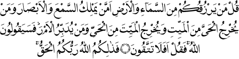 4 De ki: "Kimdir gökten ve yerden sizi rızıklandıran? Kimdir kulak ve gözler yaratıp size veren? Kimdir ölüden diriyi, diriden ölüyü çıkaran? Kimdir kâinatı yerli yerince tedbîr ve idare eden?" Onlar diyecekler ki, "Allah’tır." Öyleyse, "Hâlâ Ona ortak koşmaktan korkmaz mısınız?" de. • İşte hak olan Rabbiniz Allah Odur. (Yûnus Sûresi: 31-32.)