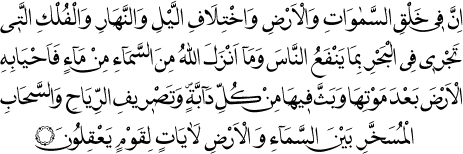 2 Göklerin ve yerin yaratılmasında, gecenin ve gündüzün değişmesinde, insanlara faydalı şeylerle denizde akıp giden gemilerde, Allah’ın gökten su indirip onunla yeryüzünü ölümünden sonra diriltmesinde, her türlü canlıyı yeryüzüne yaymasında, rüzgârları sevk etmesinde ve gökle yer arasında Allah’ın emrine boyun eğmiş bulutlarda, aklını kullanan bir topluluk için Allah’ın varlık ve birliğine, kudret ve rahmetine işaret eden nice deliller vardır. (Bakara Sûresi: 164.)