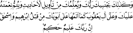 2 Rabbin seni böylece seçkin kılacak, sana rüyâ tâbirini öğretecek ve bundan önce ataların İbrâhim ve İshak üzerine peygamberlik nimetini tamamladığı gibi, senin ve Yâkuboğullarının üzerine de nimetini tamamlayacaktır. Muhakkak ki Rabbin her şeyi hakkıyla bilir, her işi hikmetle yapar. (Yûsuf Sûresi: 6.)