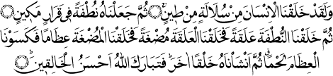 2 And olsun ki Biz insanı çamurun özünden yarattık. • Sonra onu sağlam ve korunmuş olan anne rahmine bir damla su olarak yerleştirdik. • Sonra o su damlasını pıhtılaşmış bir kan olarak yarattık. O pıhtılaşmış kanı bir parça et olarak yarattık. O et parçasını kemikler olarak yarattık. Kemiklere de et giydirdik. Sonra da onu bambaşka bir yaratılışla inşâ ettik. Yaratıcılık mertebelerinin en güzelinde olan Allah’ın şânı ne yücedir! (Mü’minûn Sûresi: 12-14.)