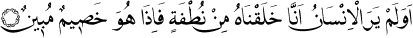 1 Görmedi mi o insan? Biz onu bir damla sudan yarattık da, sonra o Bize apaçık bir düşman kesiliverdi. (Yâsin Sûresi: 77.)