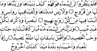 3 Üstlerindeki göğe bakmazlar mı, onu nasıl binâ edip süsledik ki, hiçbir gediği yoktur. • Yeryüzünü döşedik, onda sabit dağlar yarattık, onda her güzel çiftten bitkiler yeşerttik. • Hakka yönelen her bir kul için bunlar görüp ibret alınacak delillerdir. Gökten de bereketli bir su indirdik ve kullar için rızık olsun diye onunla bağları, daneli ekinleri, salkımları üst üste binmiş yüksek hurma ağaçlarını bitirdik. O suyla ölü bir beldeye can verdik. İşte kabrinizden çıkışınız da böyle olacaktır. (Kaf Sûresi: 6-11.)