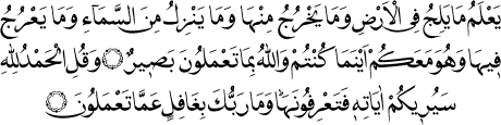 8 O, yere gireni ve yerden çıkanı, gökten ineni ve göğe yükseleni bilir. Nerede olsanız O sizinledir. Allah yaptıklarınızı hakkıyla görür. (Hadîd Sûresi: 4.) • De ki: Hamd Allah’a mahsustur; O size delillerini gösterecek, siz de onları tanıyacaksınız. Senin Rabbin, işlediklerinden habersiz değildir. (Neml Sûresi: 93.)