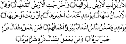 2 Ne zaman ki yer müthiş bir sarsıntıyla sarsılır. • Ve yeryüzü bütün ağırlıklarını dışarı çıkarır. • Ve insan "Ne oluyor buna?" der. • O gün yeryüzü, üzerinde bulunan herkesin ne iş yaptığını haber verir. • Çünkü Rabbin ona konuşmasını emretmiştir. • O gün insanlar yaptıklarının karşılığını görmek için hesap yerinden bölük bölük dönerler. • Kim zerre kadar bir iyilik yaparsa, onun mükâfatını görür. • Kim zerre kadar bir kötülük yaparsa onun cezasını görür. (Zilzâl Sûresi: 1-8.)