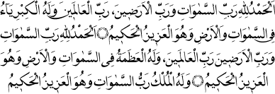 2 Göklerin ve yerlerin Rabbi olan Allah’a hamd olsun. • Göklerde ve yerlerde büyüklük sâdece âlemlerin Rabbi olan Ona mahsustur. O, sonsuz izzet ve hikmet sahibidir. • Hamd göklerin ve yerlerin Rabbi olan Allah’a mahsustur. • Göklerde ve yerlerde azamet sadece âlemlerin Rabbi olan Onundur. O sonsuz izzet ve hikmet sâhibidir.• Mülk sadece Onundur. O semâvâtın Rabbidir ve sonsuz izzet, hikmet sahibidir. (Mecmûatü’l-Ahzâb, sh. 350.)