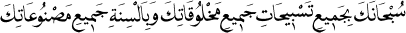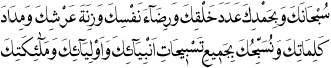 2 Mahlûkatının sayısınca, Zâtına lâyık şekilde, Arşının ağırlığınca, kelimelerinin mürekkebi miktarınca hamd ederek Seni her türlü kusur ve noksandan tenzih ederiz. Bütün peygamberlerinin, evliyâlarının ve meleklerinin tesbihâtıyla Seni tesbih ederiz.