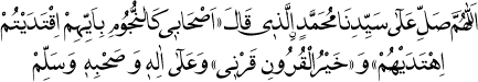 1 Allah’ım, "Sahabîlerim yıldızlar gibidir. Hangisine uyarsanız yolunuzu bulursunuz" (Keşfü’l-Hafâ, 1:132.) ve "Nesillerin en hayırlısı benim içinde bulunduğum nesildir" (Keşfü’l-Hafâ, 1:396.) diye buyuran Efendimiz Muhammed’e, Onun âl ve Ashâbına salât ve selâm eyle.