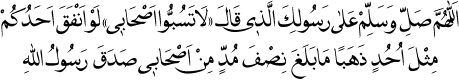 Allah’ım, "Sahabîlerime dil uzatmayınız. Biriniz Uhud Dağı kadar altını Allah yolunda harcasa, Sahabîlerimden birinin verdiği bir avuç kadar olmaz" (Allah’ın Resûlü doğru söyledi) [Müslim, Fedâil: 221; Tirmizî, Menâkıb: 58; İbn-i Mâce, Mukaddime: 11; Müsned, 3:11; Buhârî, Fedâilü Ashâbü’n-Nebî: 5.] buyuran Resûlün Muhammed’e salât ve selâm eyle.