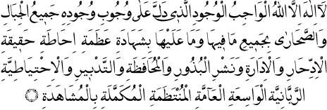 Allah’tan başka ilâh yoktur. O Vâcibü’l-Vücud ki, Rabbânî ihtiyat maddelerinin bilmüşahede vâsi ve âmm ve muntazam ve mükemmel iddihar ve idare ve muhafaza ve tedbiri ve tohumların neşri hakikatlerinin azamet-i ihatasının şehadetiyle, bütün dağlar ve sahrâlar bütün içindekiler ve üzerindekilerle beraber Onun vücub-u vücuduna delâlet eder.