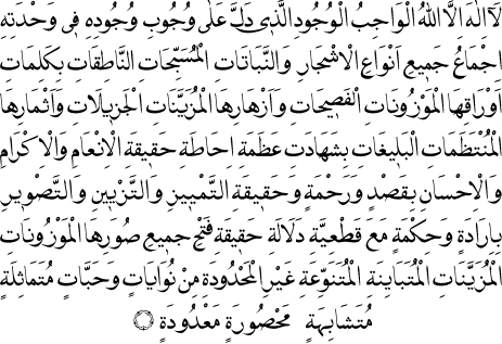 Allah’tan başka ilâh yoktur. O Vâcibü’l-Vücud ki, mizanlı ve fesahatli yapraklarının ve süslü ve cezaletli çiçeklerinin ve intizamlı ve belâgatli meyvelerinin kelimeleriyle konuşan ve tesbih eden bütün ağaç ve nebat nevilerinin icmâı, birbirinin misli ve benzeri olan mahdut çekirdek ve habbeciklerden süslü ve birbirinden farklı ve mütenevvi, gayr-ı mahdut suretlerinin hepsinin birden fethi hakikatinin kat’î delâletiyle beraber, kasdî ve rahmetli in’âm ve ikram ve ihsan hakikatinin ve iradeli ve hikmetli temyiz ve tezyin ve tasvir hakikatinin azamet-i ihatasının şehadetiyle, icmâ ile Onun vahdet içindeki vücub-u vücuduna delâlet eder.