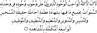 Allah’tan başka ilâh yoktur. O Vâcibü’l-Vücud ki, vüs’at ve mükemmeliyeti bilmüşahede görünen teshir ve tedbir ve tedvir ve tanzim ve tanzif ve tavzif hakikatlerinin azamet-i ihatasının şehadetiyle, semâvât bütün içindekilerle beraber Onun vahdet içindeki vücub-u vücuduna delâlet eder.
