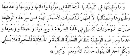 Varlıkların ölüm, yokluk, ayrılık, adem, görünme ve sönmelerindeki farklı vazifeleri ancak esma-i İlahiyenin gerektirdiği vaziyetleri göstermekten ibarettir. Bu vazife sırrından dolayıdır ki, mevcudat, ölüm, hayat, varlık ve yoklukla dalgalanan gayet süratle akan bir nehri andırır. Bu vazifeden bir daimi faaliyet ve bir sürekli Hallakıyet tezahür eder. O halde benim ve herkesin şöyle demesi gerekir: