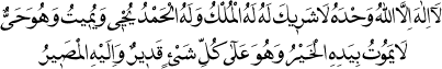 1 Allah’tan başka hiçbir ilah yoktur. O birdir. Allah bir olur; ortağı yoktur. Mülk Onundur. Ezelden ebede her türlü hamd ve övgü, şükür ve minnet Ona mahsustur ve Ona layıktır. Hayatı veren ve devam ettiren yine Odur. Ölümü de yaratan ve baki aleme alan Odur. O ezeli ve ebedi hayat sahibidir. Her hayır Onun elindedir yapılan her hayrı da kaydeder ve karşılığını verir. Onun her şeye gücü yeter ve hiçbir şey Ona ağır gelmez. Dönüş yalnız Onadır. (Hadis-i Şerif: Buhari, Ezan:155, Teheccüd: 21; Müslim, Zikir: 28, 30; Ebü Davud, Vitr: 24. )