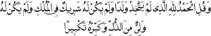 3 De ki: Hamd olsun o Allah’a ki, evlat edinmekten münezzehtir, mülkünde ortağı bulunmaz ve hiçbir şeyden de aciz değildir ki yardımcıya ihtiyacı olsun. Ve hürmet ve tazim ile Onun yüceliğini an. (İsra Suresi:111. )
