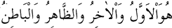 O Evveldir; başlangıcı olmadığı gibi, bütün varlıkların başlangıcı da Onun ilim ve kudretine bağlıdır. O âhirdir; sonu olmadığı gibi bütün varlıkların neticesi Ona bakar ve dönüşü Onadır. O Zâhirdir; varlık ve birliğinin delilleri her şeyde apaçık görünür ve bütün varlıklar dış görünüşleri ve sanatlı yapılışlarıyla Onun kudret ve sanatına şâhitlik eder. O Bâtındır; her şeyin hakikatine vâkıftır ve her şeyin içyüzü Onun kudret ve hikmetine şâhitlik eder. Hadid Sûresi, 57:3.