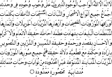 Allah’tan başka ilâh yoktur. O Vâcibü’l-Vücud ki, mizanlı ve fesahatli yapraklarının ve süslü ve cezaletli çiçeklerinin ve intizamlı ve belâgatli meyvelerinin kelimeleriyle konuşan ve tesbih eden bütün ağaç ve nebat nevilerinin icmâı, birbirinin misli ve benzeri olan mahdut çekirdek ve habbeciklerden süslü ve birbirinden farklı ve mütenevvi, gayr-ı mahdut suretlerinin hepsinin birden fethi hakikatinin kat’î delâletiyle beraber, kasdî ve rahmetli in’âm ve ikram ve ihsan hakikatinin ve iradeli ve hikmetli temyiz ve tezyin ve tasvir hakikatinin azamet-i ihatasının şehadetiyle, icmâ ile Onun vahdet içindeki vücub-u vücuduna delâlet eder.