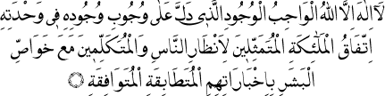 Allah’tan başka ilâh yoktur. O Allah ki, insanların nazarına temessül eden ve beşerin havâs kısmıyla konuşan melâikenin ittifakı, birbirine tetabuk ve tevafuk eden ihbaratıyla, Onun vahdet içindeki vücub-u vücuduna delâlet eder.