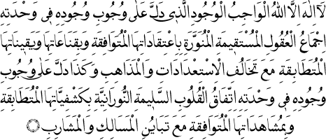 Allah’tan başka ilâh yoktur. O Vâcibü’l-Vücud ki, istidat ve mezheplerinin farklılığıyla beraber bütün münevver ve müstakim akıl sahiplerinin birbirine tetabuk eden kanaat ve yakînleri, Onun vahdet içindeki vücub-u vücuduna delâlet eder. Kezâ, birbirine mütebayin meslek ve meşreplerine rağmen bütün selim ve nuranî kalb sahiplerinin birbirine tetabuk eden keşifleri ve birbirine tevafuk eden müşahedeleri de, Onun vahdet içindeki vücub-u vücuduna delâlet eder.