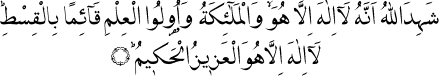 2 Bütün kâinatı adâletle tedbir ve idare etmekte olan Allah, Ondan başka ibâdete lâyık hiçbir ilâh bulunmadığını ap açık delillerle bildirdi. Buna melekler ve ilim sahipleri de şâhitlik ettiler. Ondan başka ilâh yoktur; Onun kudreti herşeye galiptir ve Onun her işi hikmet iledir." âl-i İmrân Sûresi, 3:18