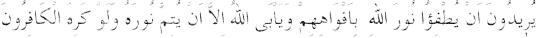 "Meâli: `Onlar Allah’ın nûrunu ağızlarıyla söndürmek istiyorlar. Allah ise-muhakkak-nûrunu tamamlamak-tamamen parlatmak-istiyor; kâfirler hoşlanmasalar da.’